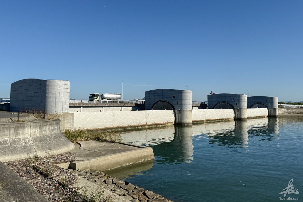 ライジングセクターゲートというのは水門に備えられた回転式のゲートを指すそうで、ここはそのゲートが幅33.4m、高さ6.9mのサイズで国内最大級の規模とのこと。